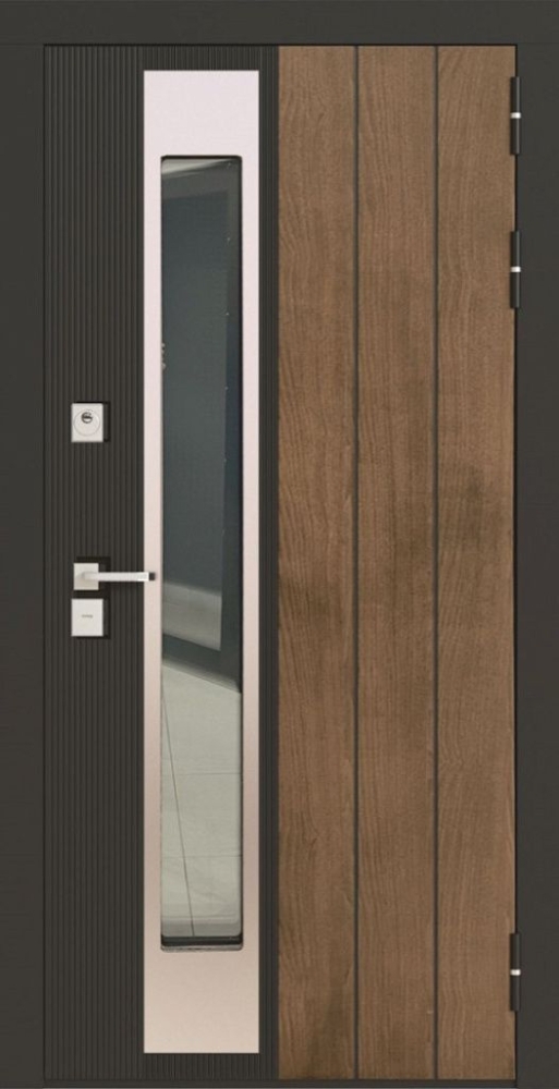 Внешняя отделка:  МДФ панель 16 мм влагостойкая, орех американский, платина черная, черная шагрень. Накладка - нерж. сталь шлифованная. Изнутри - МДФ панель 10 мм белая шагрень, металл. Вставка вокруг стеклопакета (черный муар).